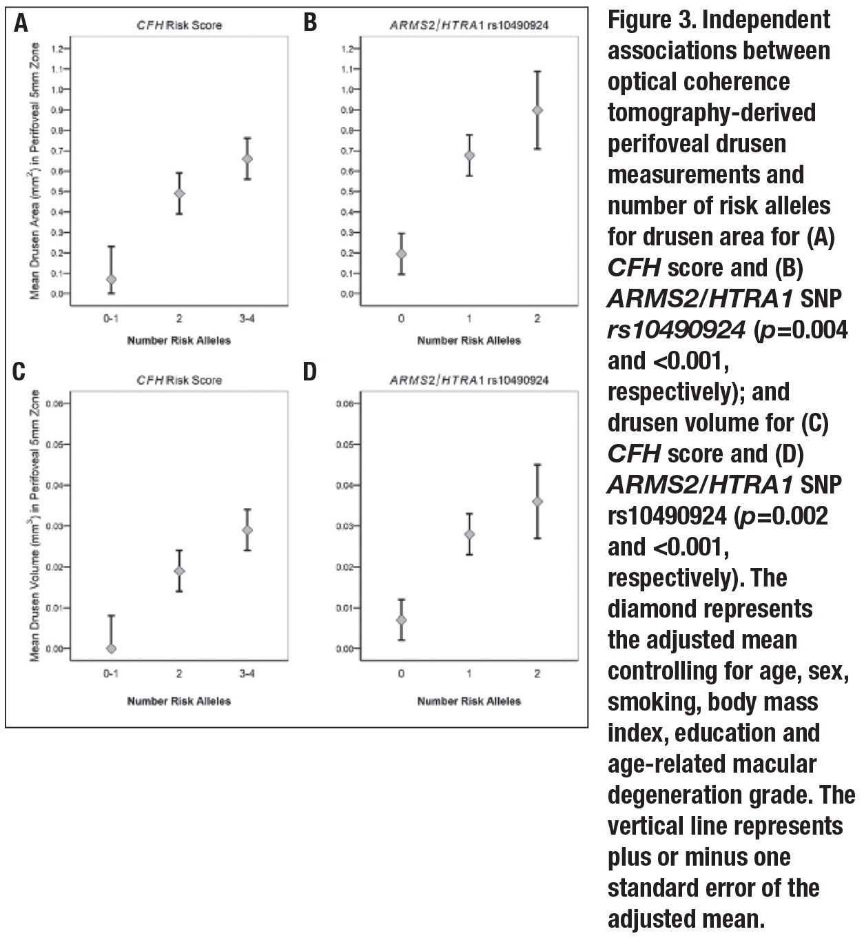 Similar comparisons were assessed for the ARMS2/HTRA1 variant. Mean drusen area and volume increased with the number of risk alleles after adjustment for other variables (p<0.001 for both drusen area and volume). Carrying two risk alleles vs. none was significantly related to greater drusen area and volume (p=0.008 and 0.004, respectively). Associations between OCT-derived perifoveal drusen measurements and genetic factors are depicted in Figure 3 (page 39).