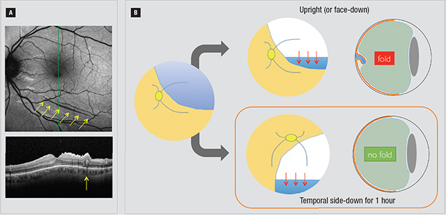 | Postoperative fold inferior to the fovea following superior retinal detachment repair (A) is easily seen with autofluorescence and OCT imaging (yellow arrows). Although small and extrafoveal, this fold caused significant distortion and visual rotation. Following vitrectomy for repair of bullous superior retinal detachments (B), upright (or face-down if the detachment extends beyond the fovea) positioning forces residual fluid to gravitate to the inferior edge of the detachment and can promote a fold. Temporal side-down positioning for the first hour immediately postoperatively shifts fluid away from the macula to prevent fold formation. |