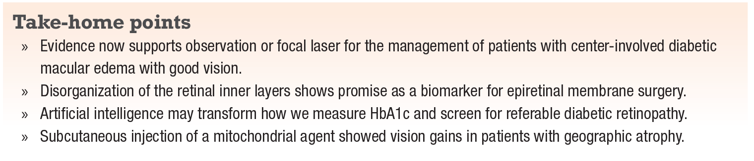 Here, we present summaries of five compelling posters and presentations: results from Protocol V of the Diabetic Retinopathy Clinical Research Network; a report about the disorganization of retinal inner layers as a biomarker for epiretinal membrane surgery; use of artificial intelligence to predict hemoglobin A1c (HbA1c) and to screen for diabetic retinopathy; and a look at a promising subcutaneous injection for dry age-related macular degeneration.