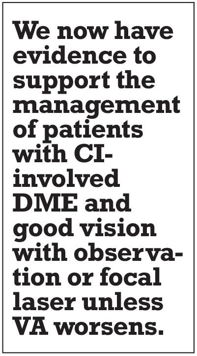 We now have evidence to support the management of these patients with observation (or focal laser) unless VA worsens, allowing us to mitigate the expense, risk and inconveniences associated with intravitreal injections. Patients given the option of observation must be made aware of the importance of close follow-up so that significant vision loss doesn’t occur between visits.