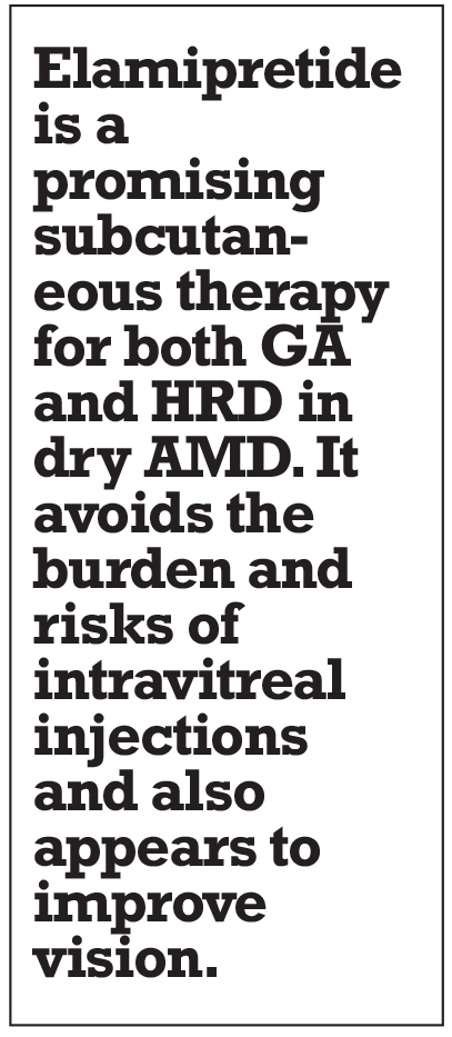 Elamipretide is a promising subcutaneous therapy for both GA and HRD in dry AMD. It avoids the burden and risks of intravitreal injections and also appears to improve vision (a rarity in the current research landscape for treatment of dry AMD). A Phase II clinical trial for dry AMD with GA is underway.