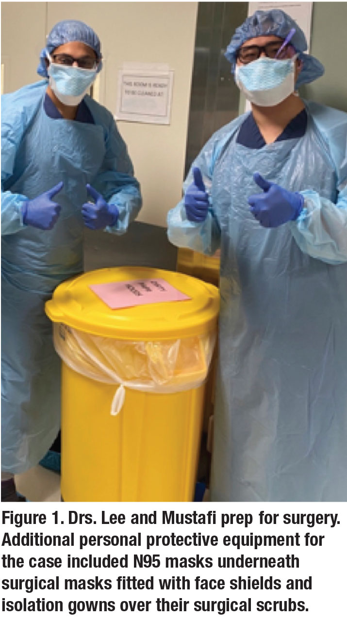 On the morning of the surgery, the patient was again placed in a negative-pressure room in the preoperative area, and trained personnel helped us don and doff before were entered and after we exited the room. Another interesting twist was that the patient’s spouse also tested positive for COVID-19 and had to be placed in an isolated waiting room for the duration of the case.