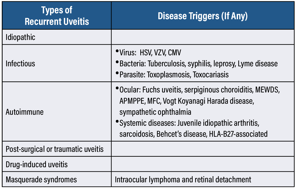 Appropriate management of recurrent uveitis requires identifying any underlying etiology and monitoring for adequate treatment response.