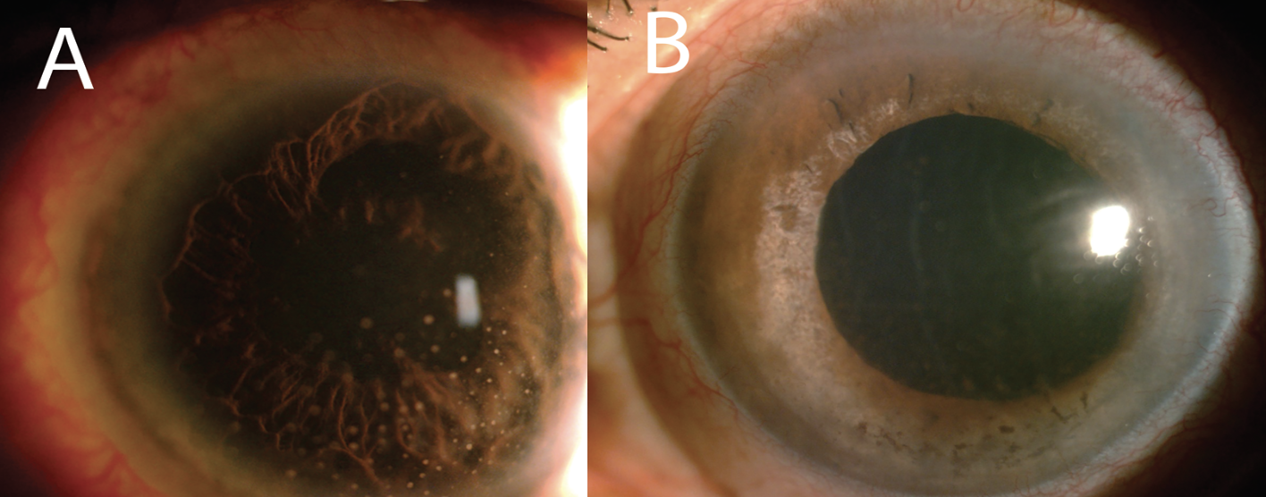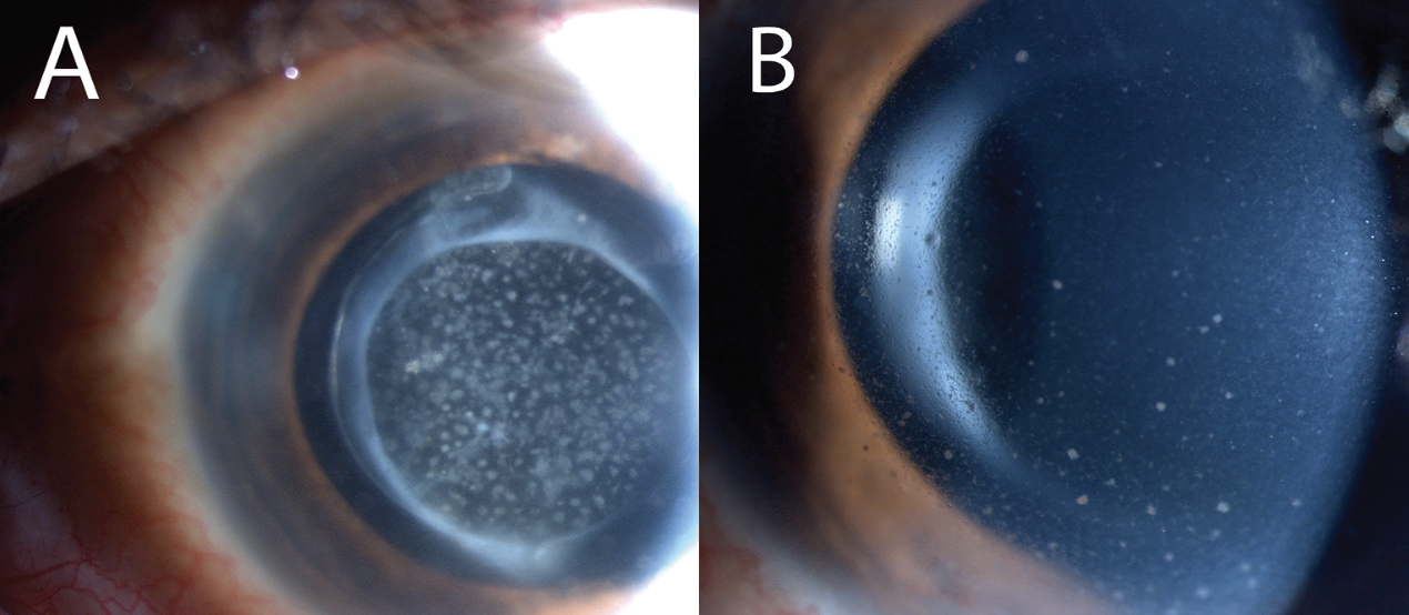 Figure 1. HSV-associated uveitis in a 35-year-old patient presenting with (A) diffuse, stellate, white keratic precipitates and (B) intraocular lens deposits. |