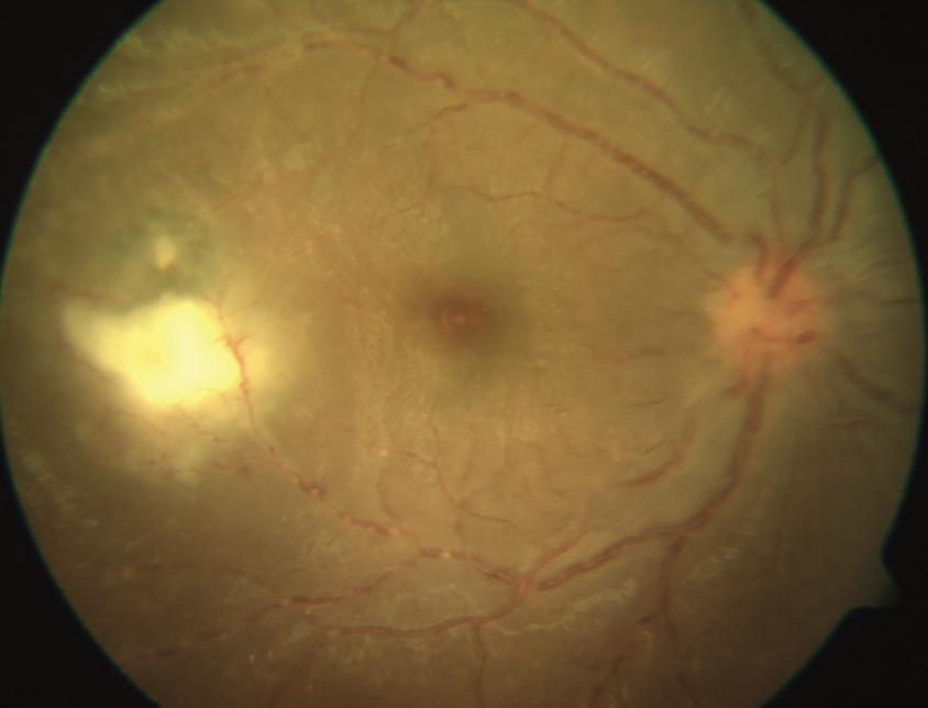 Posterior involvement is characterized by retinal infiltrates, vasculitis, macular edema, retinal pigment epithelium hyperplasia and/or peripheral retinal neovascularization.5 Acute retinal necrosis, predominantly affecting immunocompetent individuals, is most commonly associated VZV, less frequently HSV, and only rarely with CMV or Epstein-Barr virus. Clinically, ARN presents with vitritis, occlusive vasculitis, arteriolar thrombosis, peripheral necrotizing retinitis and, in some cases, optic neuritis. The retinitis typically manifests as deep, multifocal yellow-white lesions that coalesce in a concentric distribution within the peripheral retina, often sparing the macula. The distinct demarcation between necrotic and viable retina predisposes affected eyes to retinal breaks and rhegmatogenous retinal detachment.