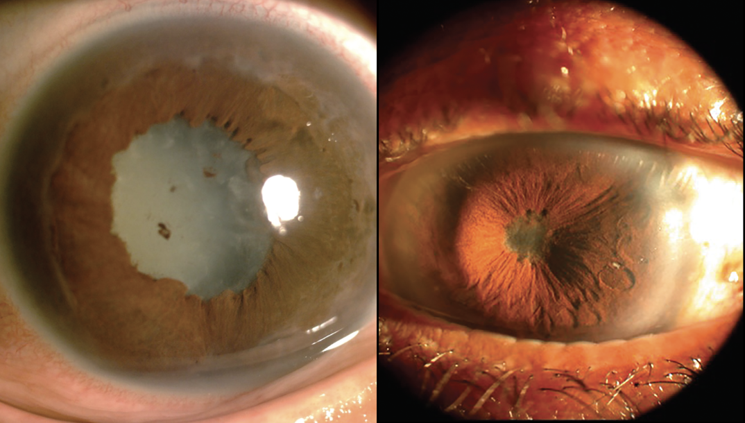 Anterior involvement presents with unilateral, elevated intraocular pressure, fine-to-medium keratic precipitates and varying anterior chamber inflammation (Figure 1). There may be concurrent epithelial keratitis, stromal keratitis and/or endotheliitis, depending on etiology. Additionally, HSV and VZV may present with posterior synechiae and/or sectoral iris atrophy (Figure 2).4