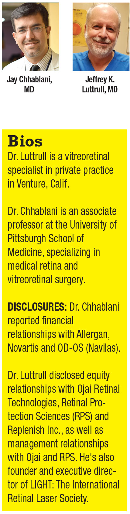 Pro, Dr. Chhablani: Pattern scanning/navigation for continuous wave reduces treatment time with increased comfort to the patient as well as reduces re-treatment rate.14-17 Subthreshold lasers are painless and faster.