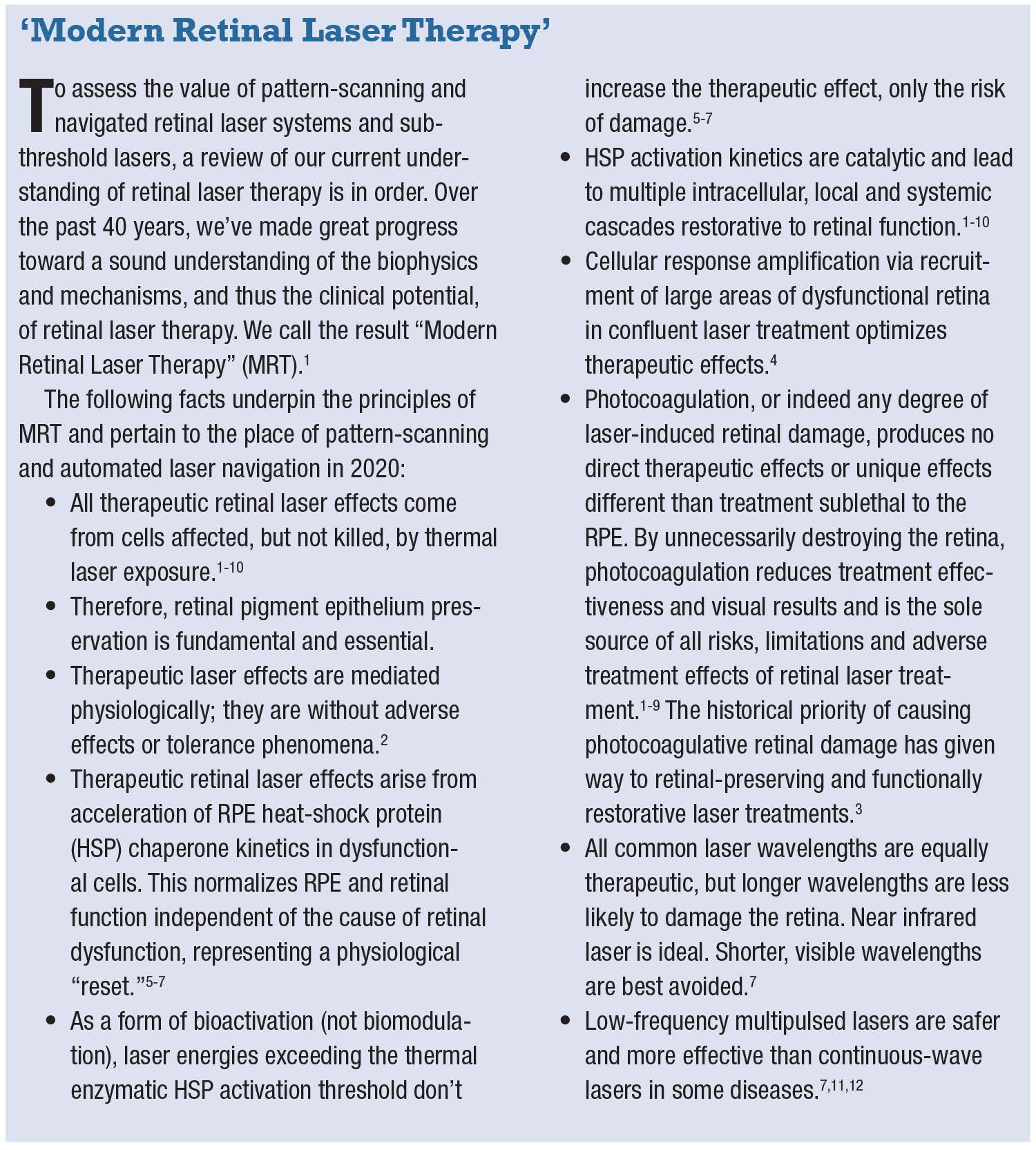 Con, Dr. Luttrull: Patterns—grids, originally—were used to allow photocoagulation of broad areas of retina while preserving enough function to prevent profound visual loss. Modern retinal laser therapy (MRT) instead improves retinal and visual function directly where it’s applied and faces no such constraint.