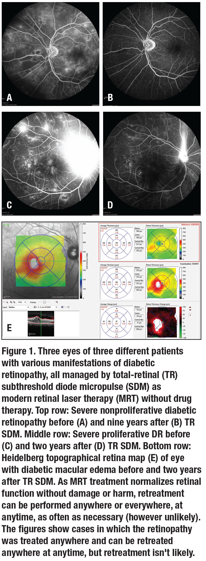 Con, Dr. Luttrull: As identifiable MRT lesions are absent (like drug therapy), some laser platforms offer virtual documentation of treatment placement. The implication is that retreatment of a given area is undesirable, or that one needs evidence beyond the therapeutic effect of treatment having been done. The former is obviously relevant only to photocoagulation, which needs no virtual documentation. The latter has never been a concern with drug therapy. As MRT is reliably sublethal to the retina, MRT, like drug therapy, can be repeated infinitely anywhere in the retina, including previously treated areas. There’s no reason to know where you’ve been; only what you want to do next (Figure 1).