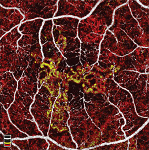 Choroidal neovascular (CNV) membrane area can be automatically measured with OCT angiography (RTVue-XR, Avanti, Optovue) using a saliency-based algorithm with excellent repeatability. In a small, prospective study, seven treatment-naïve patients with CNV due to neovascular AMD underwent OCT angiography scans at baseline and monthly visits while being treated on a PRN basis with anti-VEGF medication. Six of seven eyes showed initial reduction in CNV area over the course of three anti-VEGF injections, demonstrating its utility in monitoring treatment response.