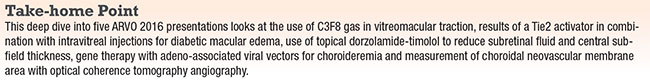 Intravitreal injection of C3F8 gas demonstrated superior release rates for symptomatic VMT when compared to both intravitreal injections of SF6 gas and ocriplasmin (Jetrea, ThromboGenics). One hundred thirteen consecutive patients with VMT were treated with one of three interventions: 0.25 mL of 100% C3F8 gas (32 patients); 0.25 mL of 100% SF6 gas (27 patients); and 0.1 mL of ocriplasmin (54 patients). Patients who received gas injections were instructed to perform “drinking bird” head movements, in which they would bob their head forward and backward two to three times every hour for the first few days after injection.