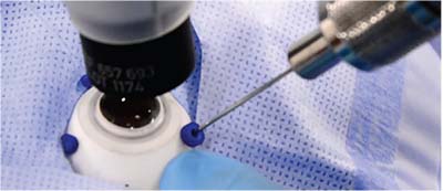 | Figure. Insertion of the microneedle through a port in simulated robotic ocular surgery. |