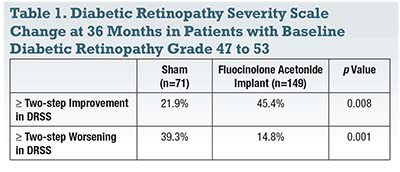 The investigators reported a statistically significant difference in change in overall mean DRSS score between Iluvien- and sham-treated patients at almost every time point during the 36-month trial. The Iluvien-treated group also had a significantly greater proportion of patients that achieved at least a two-step improvement in DRSS score and a reduced proportion of patients with a two-step or greater worsening in DRSS score over time (Table 1).