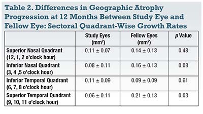 Twelve months after treatment, the researchers found no statistically significant difference in the mean change in total GA area between study and fellow eyes. However, the sectoral growth rate of GA in the superotemporal quadrant where the injections were placed was significantly slower in study eyes (0.06 ± 0.11 vs. 0.21 ± 0.13 mm2, p=0.03). The progression rate in the superotemporal quadrant was also significantly slower than the other three quadrants of the study eye combined (p=0.003).