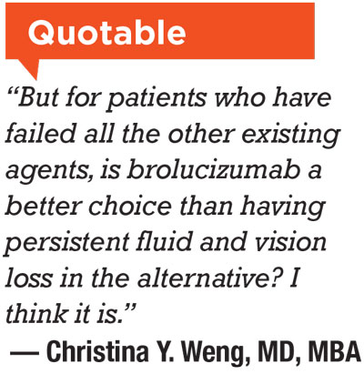 Christina Y. Weng, MD, MBA, associate professor, Baylor College of Medicine, Houston: “I still think that it holds a spot for a certain subset of patients.” She doesn’t use brolucizumab as an option in treatment-naive patients. “But for patients who have failed all the other existing agents, is brolucizumab a better choice than having persistent fluid and vision loss in the alternative? I think it is.” RS