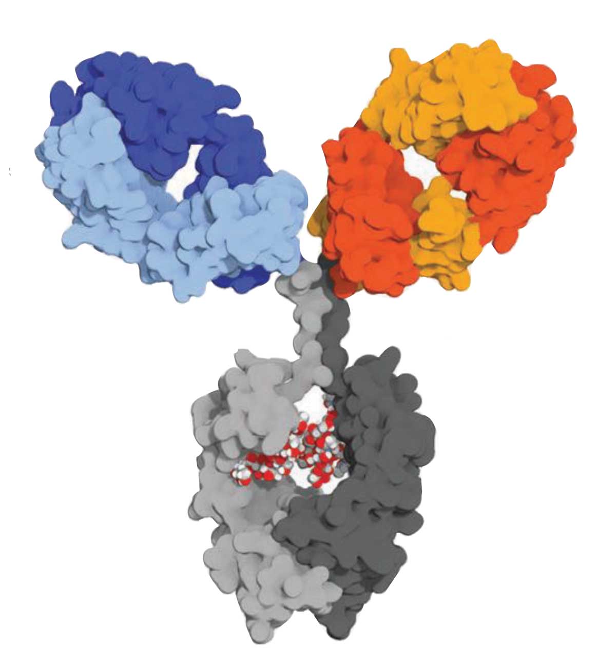 | Vabysmo consists of one molecule with two active arms: an anti-VEGF-A fragment antibody (Fab) (blue) and an anti-Ang-2 Fab (orange and red). The optimized fragment (gray) has no effective agent. |