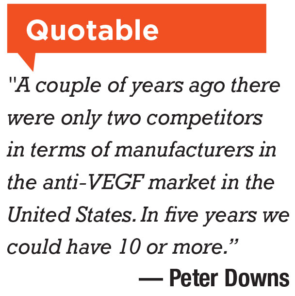With at least two more investigative Lucentis biosimilars and Outlook Therapeutics’ ophthalmic formulation of Avastin (bevacizumab) “hot on their heels,” and other anti-VEGF treatments in Phase III trials, “In five years we could have 10 or more manufacturers competing in this space,” Downs said.