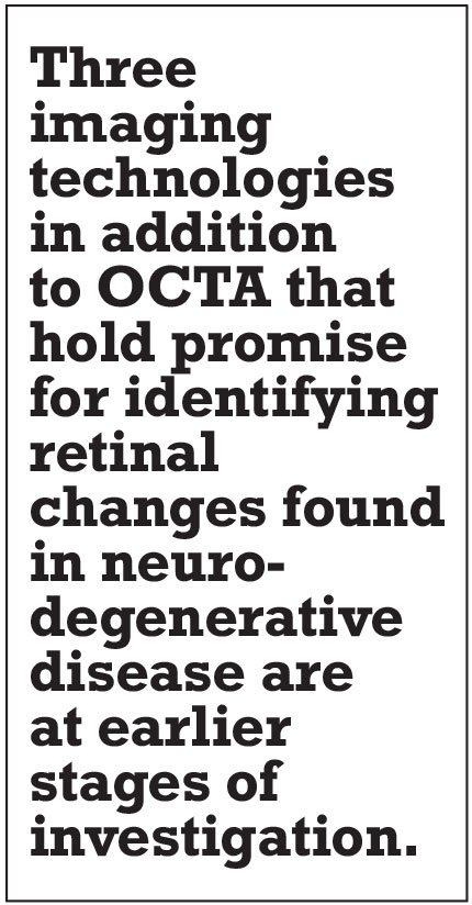 While OCT has been the mainstay for identifying many retinal changes found in neurodegenerative diseases, a number of emerging technologies hold additional promise. In addition to OCTA, three additional technologies are at much earlier stages of investigation, but have already begun to yield insights into AD.
