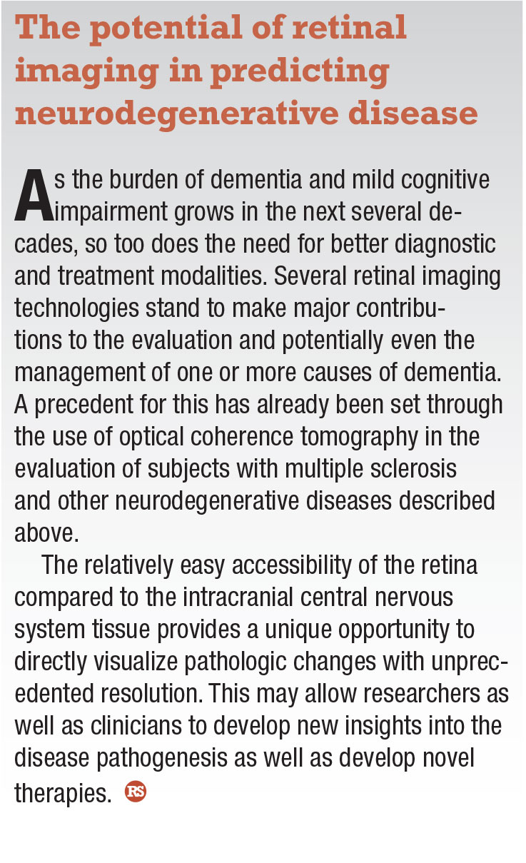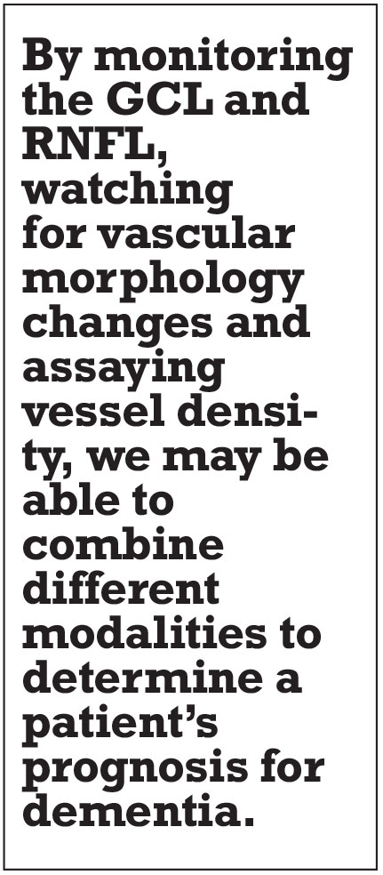 An ounce of prevention is worth a pound of cure. By monitoring thinning in the GCL and RNFL, watching for changes to vessel morphology and assaying vessel density, we may be able to combine different imaging modalities to determine a patient’s diagnostic likelihood for dementia. We may then begin to answer questions regarding prevention and treatment efficacies and make observations on whether retinal changes are progressive, and whether they can be reversed. In this way, noninvasive ophthalmic imaging is likely to continue to develop an increasing role in the diagnosis and possibly management of subjects with dementia. RS