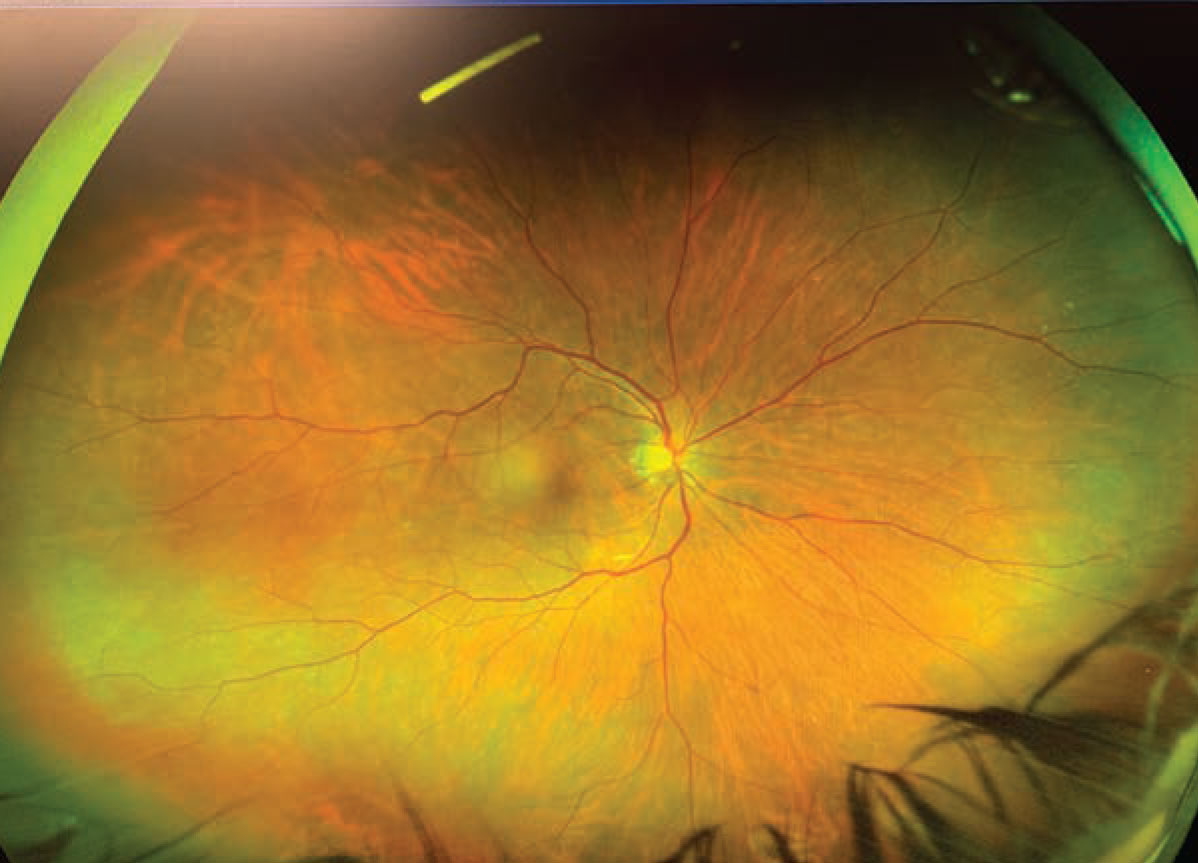 The fluocinolone acetonide intravitreal implant 0.18 mg (Yutiq, EyePoint Pharmaceuticals) can be observed at the 12 o’clock position in the posterior segment. |