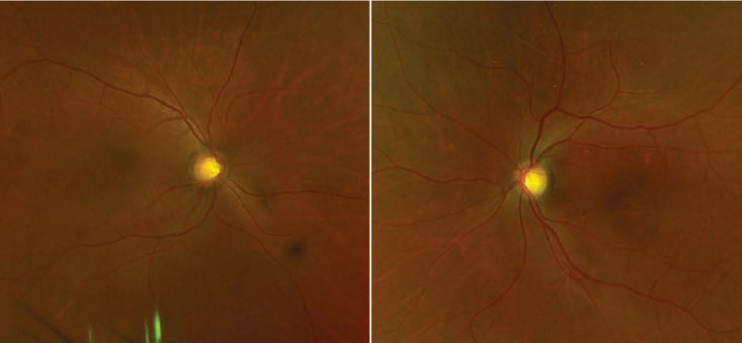 The fundus examination was remarkable for bilateral, multifocal areas of subretinal fluid (SRF) in the macula, including foveal involvement. There were no abnormalities in the periphery (Figure 1). Optical coherence tomography scans demonstrated subfoveal fluid in both eyes with multifocal, smaller collections of SRF. The interdigitation zone was thickened and irregular. With enhanced-depth imaging, the choroid appeared to be not substantially thickened bilaterally (Figure 2).
