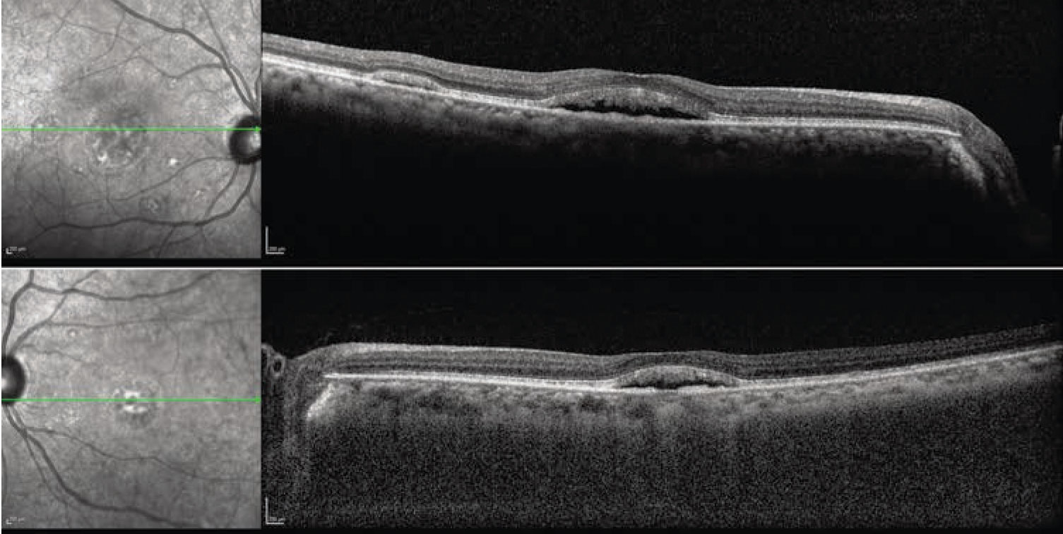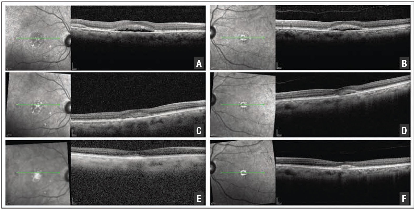 A fundus examination showed a stable number of subretinal foci compared to the first visit. OCT scans showed interval improvement in the amount of SRF (Figure 5, page 12). OCT angiography didn’t show any evidence of macular neovascularization (Figure 6, page 13). The SRF was nearly resolved at the four-month follow-up, and visual acuity had improved to 20/30 OD and 20/40 OS, although subfoveal changes persisted (Figure 5).