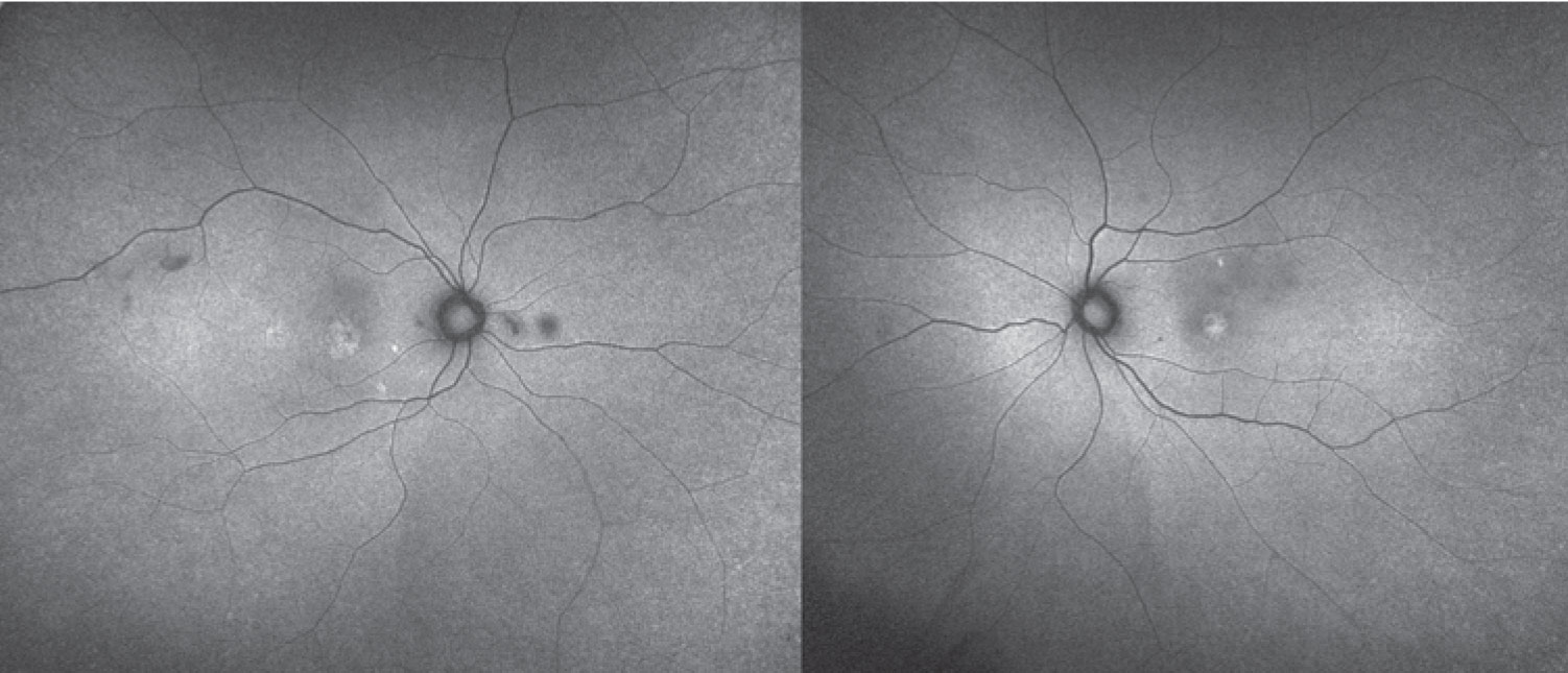 Given the ophthalmoscopic exam, we pursued further diagnostic imaging. Fundus autofluorescence revealed bilateral areas of hyperautofluorescence that correlated to the accumulation of SRF. We observed no foci of hyperautofluorescence in the periphery. Absent were gravity-dependent fluid shifts, or guttering (Figure 3).