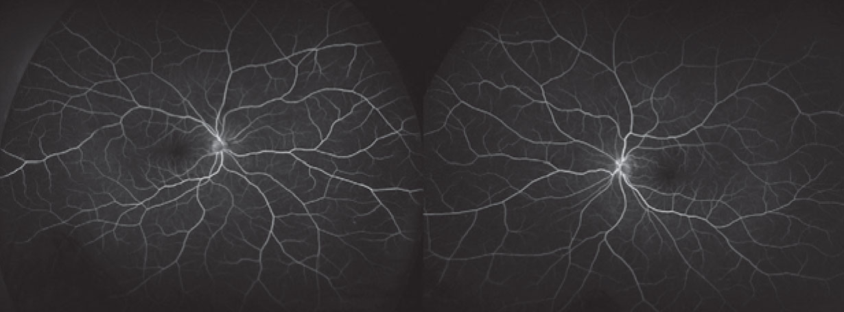 Fluorescein angiography demonstrated a normal vascular pattern in both eyes. There was no evidence of dye leakage from the microvasculature or leakage into the collections of subretinal fluid (Figure 4).