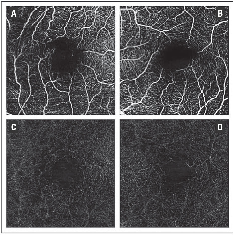 | Figure 6. Optical coherence tomography angiography four weeks after presentation shows no evidence of macular neovascularization (OD right column, OS left column). A and B show the superficial vascular complex, C and D the avascular complex. |