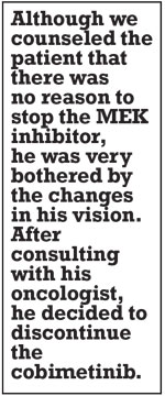 Although we counseled the patient that there was no definitive ocular indication to stop the MEK inhibitor, he was very bothered by the visual changes. After consulting with his oncologist, he decided to discontinue the cobimetinib. Four weeks after the initial visit, his visual acuity had improved to 20/40 OU.