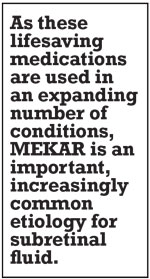As these lifesaving medications are used in an expanding number of conditions, MEKAR is an important, increasingly common etiology for SRF. Although the fluid is usually bilateral, subfoveal and multifocal, the visual impact is usually mild and self-limited. Management should be coordinated with a patient’s oncology team, and many patients can continue taking the medication safely. RS