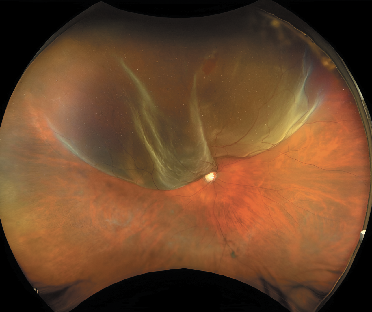 | Superior macula-splitting retinal detachment with a single horseshoe tear located between 12 and 1 o’clock in a phakic patient, an ideal candidate for pneumatic retinopexy. |
