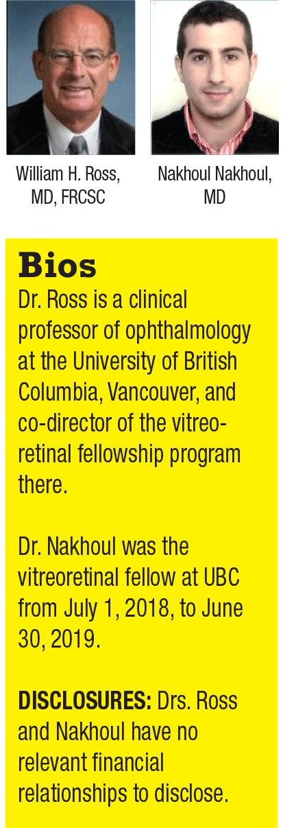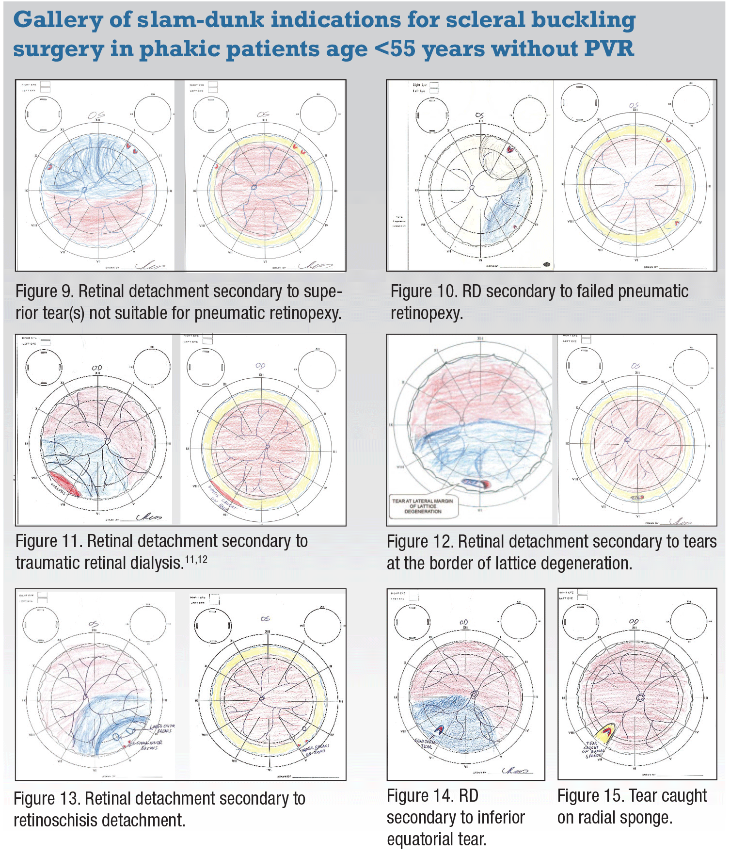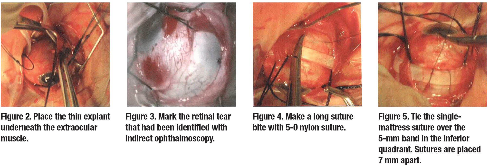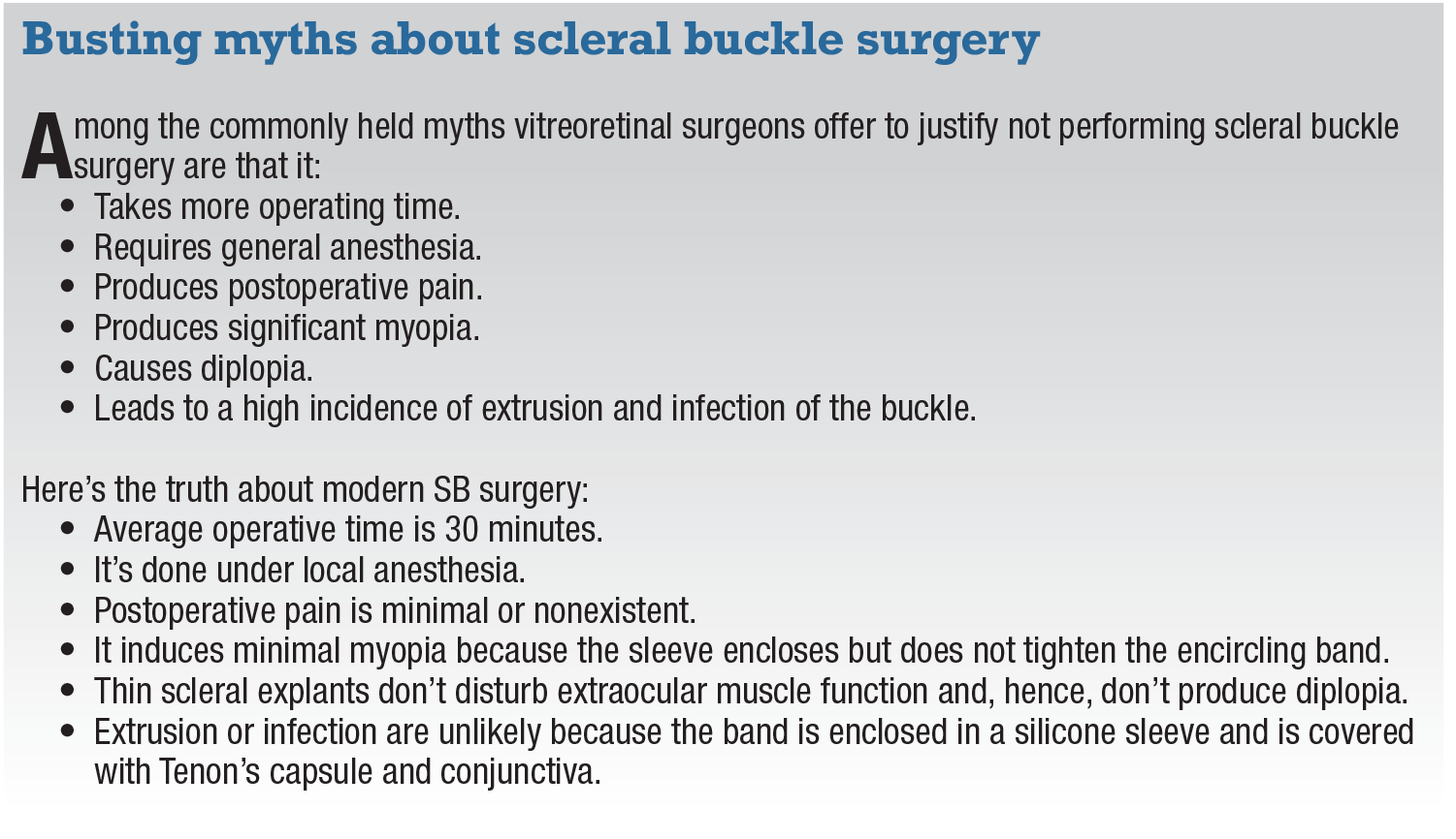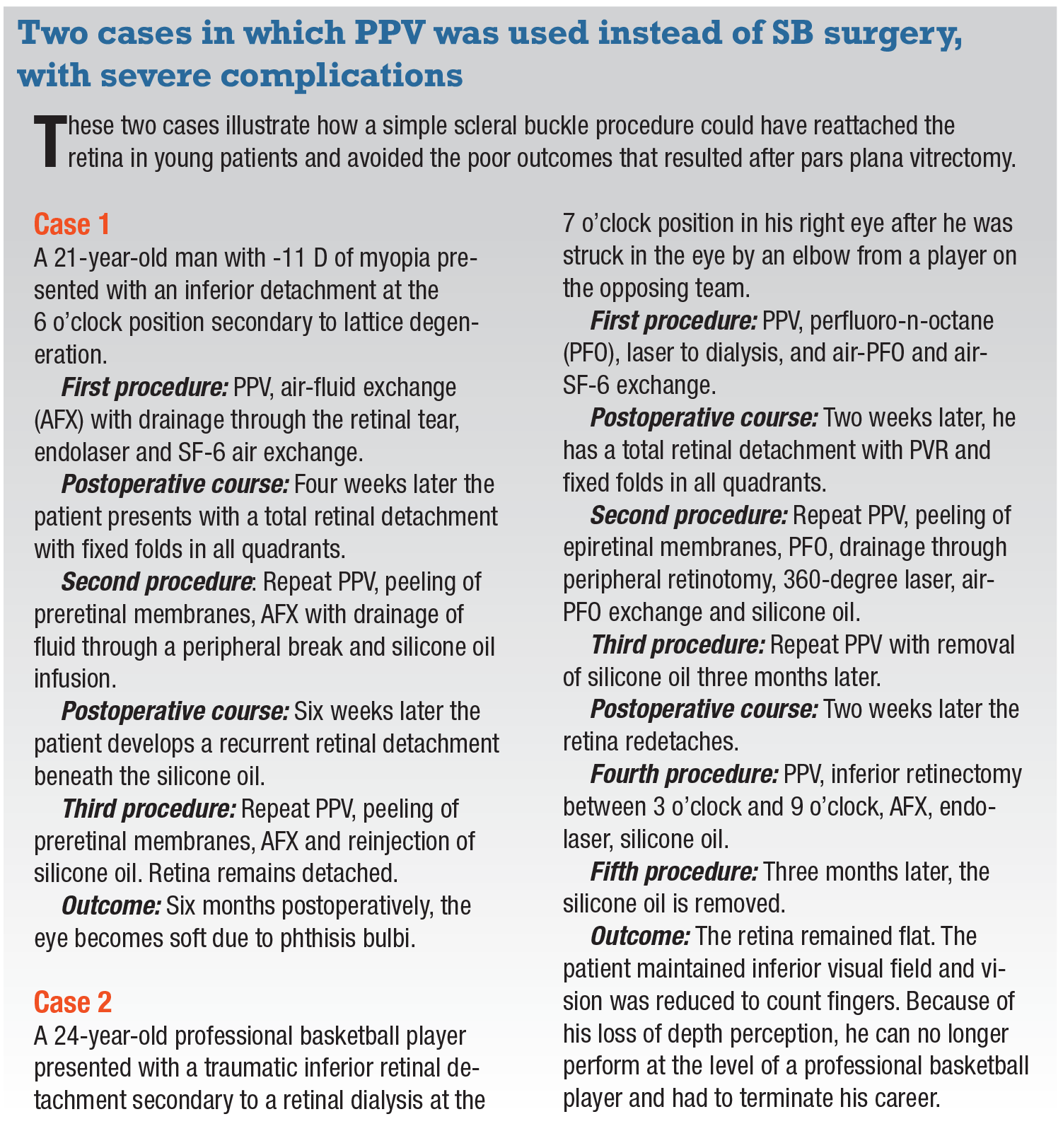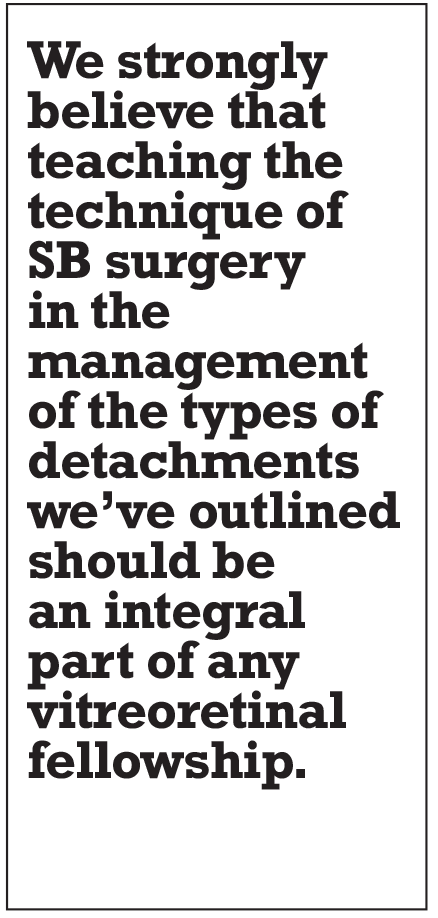 It’s interesting to speculate why SB surgery is no longer used universally in the management of phakic detachments.7,8 The reason may be that many vitreoretinal fellowships no longer teach SB surgery. It requires properly marking the retinal breaks, placing the scleral sutures and draining the subretinal fluid, if necessary. We strongly believe that teaching the technique of SB surgery in the management of the types of detachments we’ve outlined should be an integral part of any vitreoretinal fellowship.
