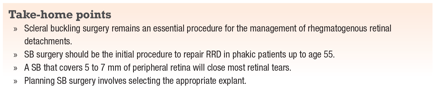 The development of small-gauge vitrectomy units with high-speed cutters, wide-angle systems and perfluorocarbon liquid has revolutionized the repair of rhegmatogenous retinal detachments and has led to the misconception that scleral buckling surgery is no longer needed in the management of RRD. However, the use of SB surgery remains an essential procedure in RRD management.