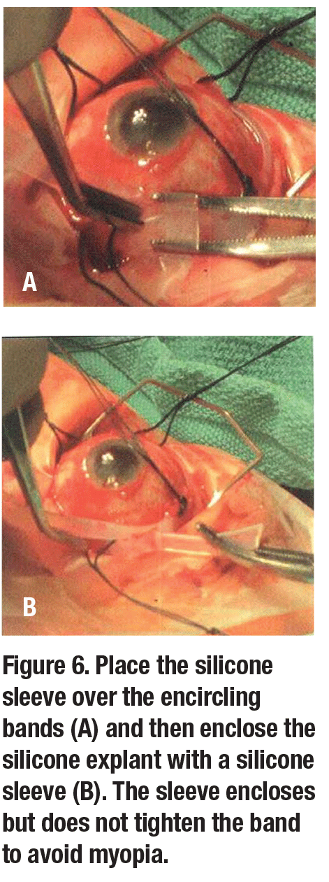 11. Place the silicone sleeve to enclose, not tighten, 5-mm band to avoid myopia (Figure 6 ).