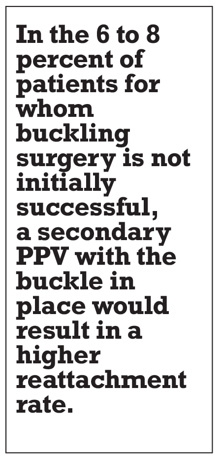 In the 6 to 8 percent of patients for whom buckling surgery is not initially successful, a secondary PPV with the buckle in place would result in a higher reattachment rate.