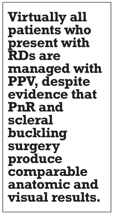 At our institution, each vitreoretinal fellow performs between 120 and 200 PnR procedures and 35 and 70 SB operations during the one-year program. We’ve trained 57 VR fellows since 1986, including 11 from Canada and 29 from the United States. However, we’ve noted that the majority of vitreoretinal fellowships in the United States and abroad don’t adequately teach the value of PnR procedures and SB surgery in the management of phakic RDs. Virtually all patients who present with RDs are managed with PPV, despite evidence that PnR and scleral buckling surgery produce comparable anatomic and visual results.