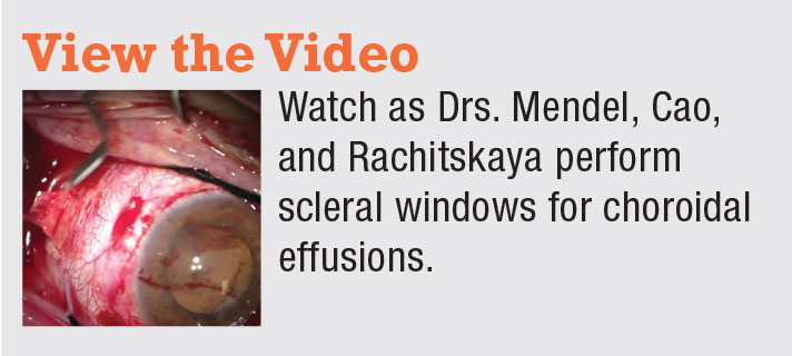 It’s been hypothesized that in a patient with choroidal effusions, especially in the setting of nanophthalmos, the thickened sclera can compress vortex veins and lead to formation and persistence of choroidal effusions and serous retinal detachments. In these cases, scleral windows can increase uveoscleral outflow. For this procedure, careful patient selection with an appropriate discussion of prognosis and expectations is important because the serous retinal detachment usually improves gradually.