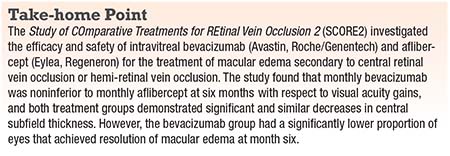 In sum, in SCORE2 participants with macular edema due to CRVO or HRVO, intravitreal bevacizumab was noninferior to intravitreal aflibercept with respect to visual acuity after six months of treatment, based on a non-inferiority margin of a VALS of five. Both groups demonstrated significant decreases in CST from baseline to month six, with no significant difference between the groups with respect to the magnitude of CST reduction.