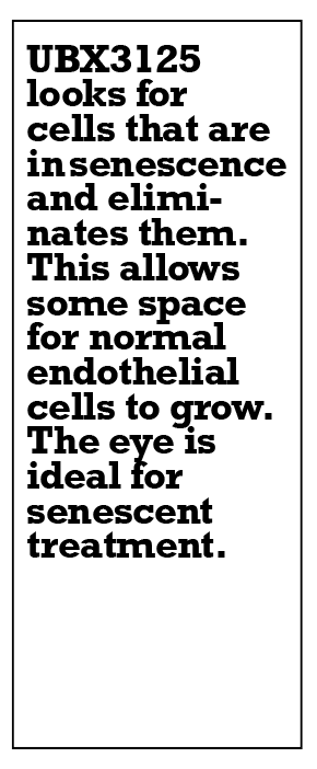 A: UBX3125 looks for cells that are in senescence and eliminates them. This allows some space for normal endothelial cells to grow. That’s the beauty of senescent treatment. The eye is ideal for it because, obviously, it’s sequestered to this one tissue where we can make sure the effect is very local.