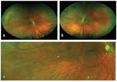 ![]() | Figure 1. Widefield fundus photographs of the right (A) and left (B) eyes. Higher magnification (C, inset of A) of the right eye discloses two segments of intra- arterial plaques (arrowheads). |