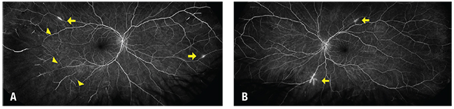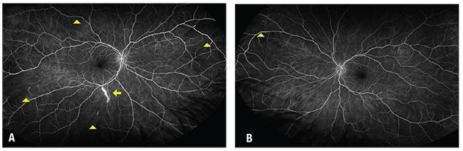 | Figure 4. Fluorescein angiogram of the right eye (A) shows increased areas of arteriolar nonperfusion (arrowheads) and new segments of arterial wall hyperfluorescence (AWH, arrow). The left eye (B) also displays new AWH (arrows). |