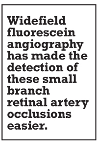 At her visit in the retina clinic, visual acuity was 20/40 OD and 20/30 OS. Intraocular pressures were normal. The anterior segment was quiet and unremarkable bilaterally. Fundus examination of the right eye disclosed multifocal yellow intra-arterial plaques (Figure 1). The left eye fundus was normal. Widefield fluorescein angiography demonstrated multiple arteriolar occlusions and segmental arteriolar leakage of the right eye and focal non-perfusion of the left eye (Figure 2, page 12). The left eye was normal. Optical coherence tomography of the macula was normal bilaterally.