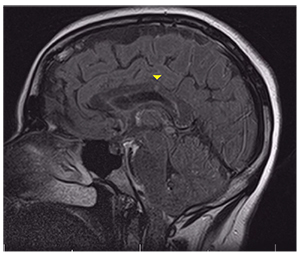 | Figure 3. Fluid-attenuated inversion recovery MRI shows a focal hyperintense foci in the corpus callosum (arrowhead). |