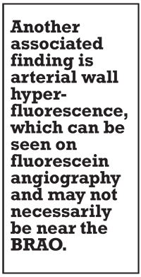 In 1986, J. Donald Gass, MD, and colleagues described what we now refer to as Gass plaques, which are yellow arteriolar wall deposits often distributed along the mid-segment of the vessel away from the bifurcation points.5,6 Another associated finding is arterial wall hyperfluorescence, a prominent feature in our patient, which can be seen on fluorescein angiography and may not necessarily be located near the BRAOs.7