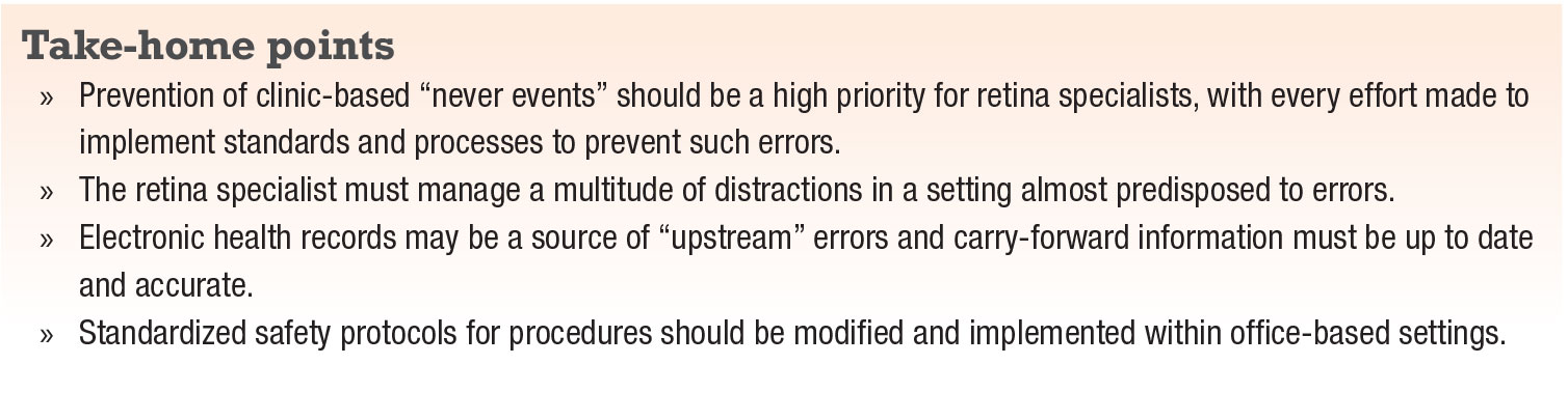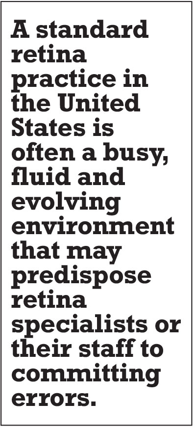 A standard retina practice in the United States is often a busy, fluid and evolving environment that may predispose retina specialists or their staff to committing errors. As opposed to the OR, where the focus of the care team is typically on only one patient in one room at a time, a provider in a retina clinic may see in excess of 50 patients on an average day spread over multiple rooms that are in constant turnover. Furthermore, the physician in the clinic also faces a multitude of distractions—phone calls, texts and staff interruptions.