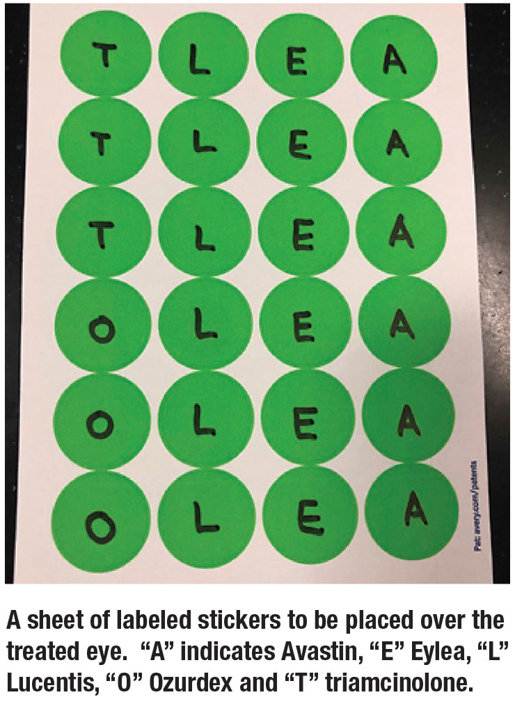 In our practice, we have developed a standardized clinical protocol for in-office procedures to address safety concerns and potentially reduce the risk of WSPEs (box). Our protocol begins when the physician and patient agree on a treatment plan. Before each procedure, the informed consent is either obtained or reviewed. This provides an opportunity to confirm the eye (or eyes in the case of a bilateral treatment plan) and medication. With the scribe present, the physician will then place a sticker over the eye or eyes. The sticker has a large capital letter indicating the name of the medication (A for Avastin, E for Eylea, etc., Figure, page 29).