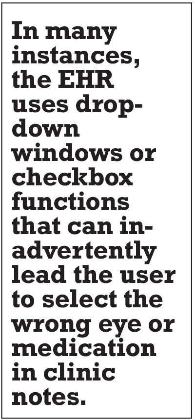 Medical records can become a source of WSPEs starting with the initial clinic encounter. A recent study found that “upstream” errors in the form of erroneous lens specifications or calculations originating in the clinic may be responsible for up to a quarter of WSPEs in ORs. These errors would not have been necessarily prevented by conducting a time-out in the OR.6 Many electronic health record systems use drop-down windows or checkbox functions that can inadvertently lead the user to select the wrong eye or medication in clinic notes.