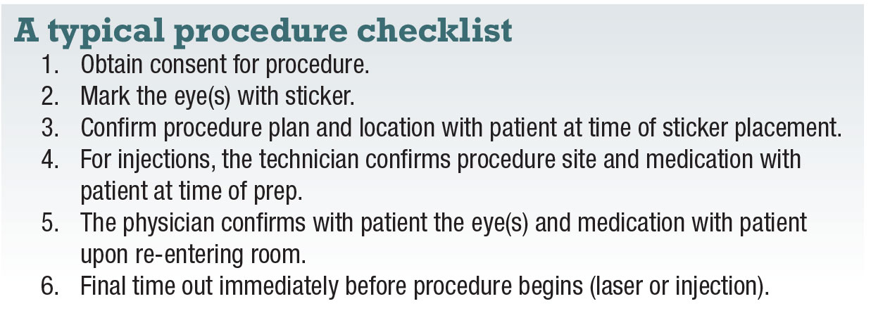 We use this general protocol for other office procedures, such as lasers and pneumatic retinopexy. These repeat checks and confirmations at multiple stages of the process reduce the risk of error with in-office procedures without adding significant time to the process. Having the patient and other team members participate in the site and medication confirmation reduces reliance on memory and helps the retina specialist better deal with the workload, complexity and stressors of a busy retina practice. The medication-specific sticker serves as a visual reminder that creates shared situational awareness amongst all team members.