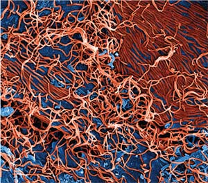 | Colorized scanning electron micrograph of filamentous Ebola virus particles (red) attached and budding from a chronically infected VERO E6 cell (blue) (25,000-x magnification). National Institute of Allergy and Infectious Diseases, National Institutes of Health photo. |